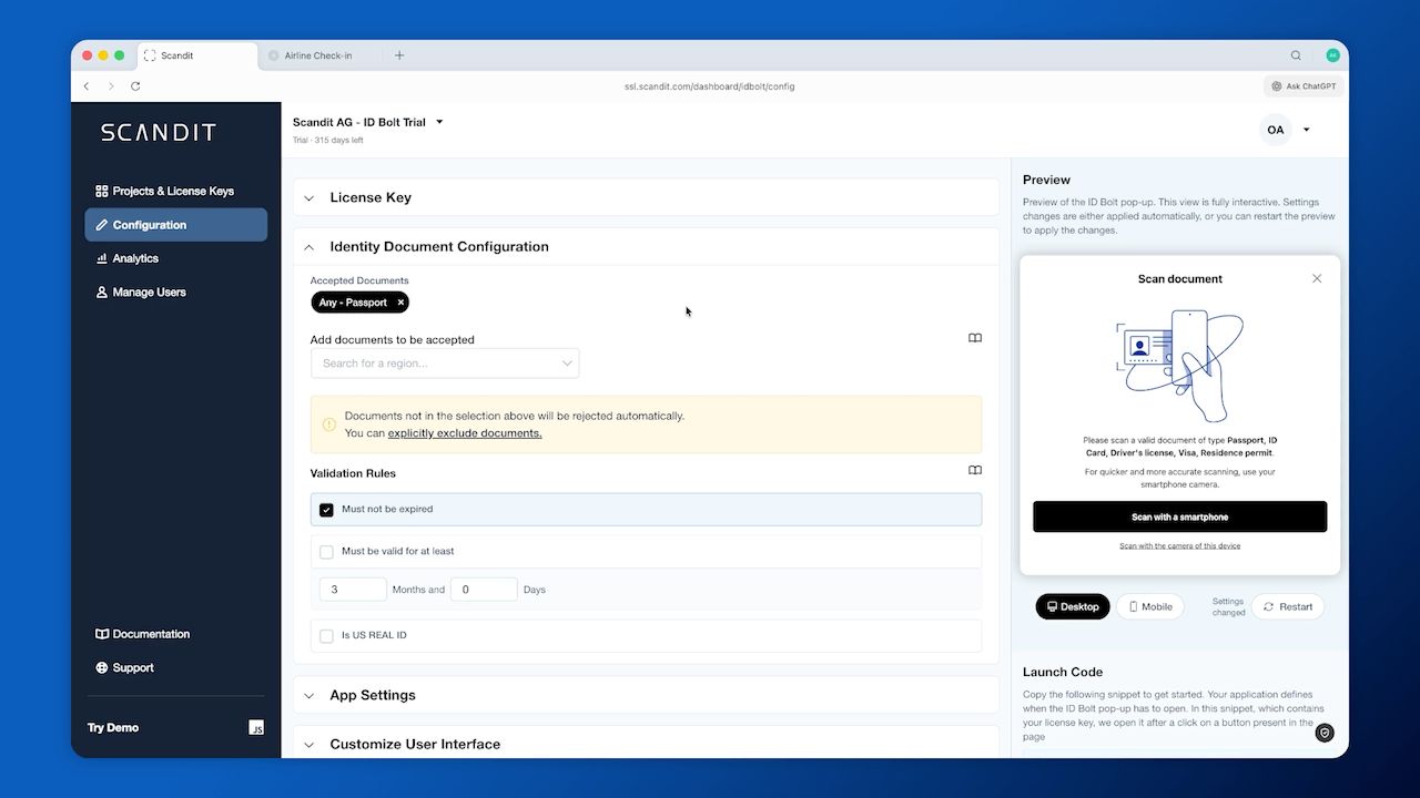 With the ID Bolt Studio, you can quickly and easily apply your desired scanning workflows and brand to ID Bolt. Test different configurations and whitelabeling options directly in your Scandit dashboard, then copy working code to your website.